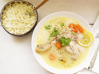 Heute gibt es „Avgolemono“. Avgolemono ist ein griechisches Rezept, dabei handelt es sich um eine frische Hühnersuppe mit verquirlten Eiern und Zitronensaft. Ein unglaublich schmackhaftes Gericht. In Griechenland bekommt man Reis oder Nudeln dazu serviert. Ich habe für meine Suppe einen Karfiolreis als Suppeneinlage gemacht.